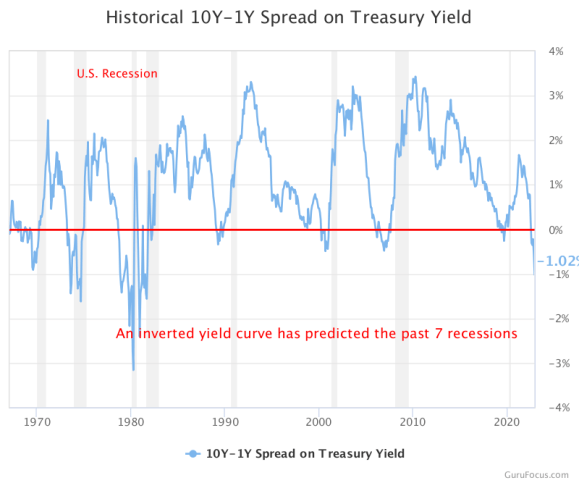 As you can see from the chart above, short term rates are higher than long term rates, indicating an inverted yield curve. An inverted yield curve implies an impending recession – the question is when?