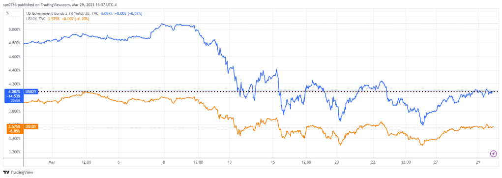 The above chart shows the dip in borrowing costs over the last month. Since the Fed’s fight against inflation has taken a back seat to financial stability, the cost to borrow money has fallen and led to a rally in high growth names that borrow a ton of money.
